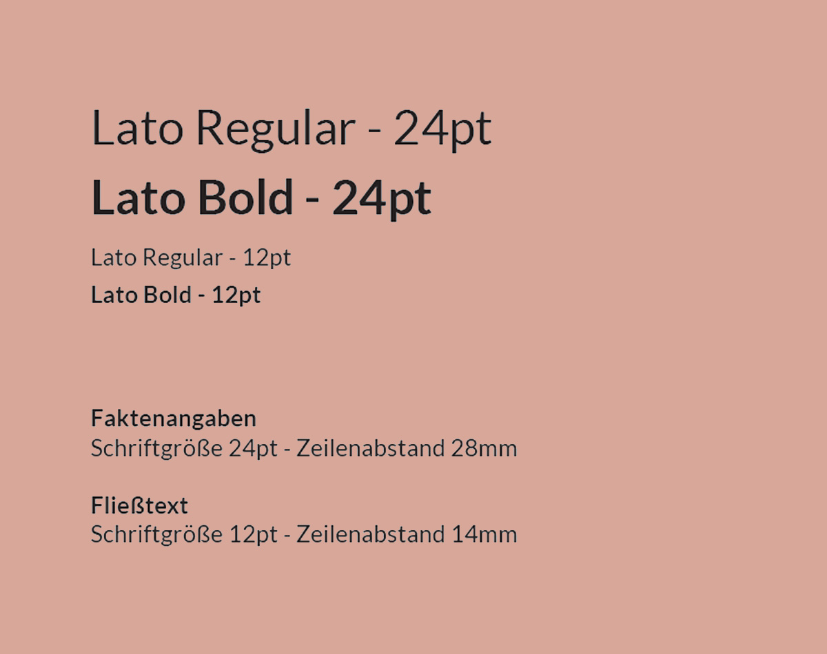 Die Schrift „Lato“ ist dafür verantwortlich, Fakten klar zu vermitteln. Dank ihrer besseren Leserlichkeit ist sie besser geeignet als „Modern Love“. Somit werden sämtliche Fließtexte in „Lato Regular“ verfasst. Falls eine klare Abgrenzung erforderlich ist, die nicht durch „Modern Love“ gelöst wird, erfolgt dies durch den Schriftschnitt „Lato Bold“, anstelle von einer Änderung der Schriftgröße. Generell dient „Lato“ dazu, „Modern Love“ zu unterstützen. Wenn genaue Datenaufzeichnungen von Bedeutung sind, kommt „Lato“ zum Einsatz. Die Schriftgröße ist dabei anpassbar, solange sie zur Schriftgröße von „Modern Love“ passt.