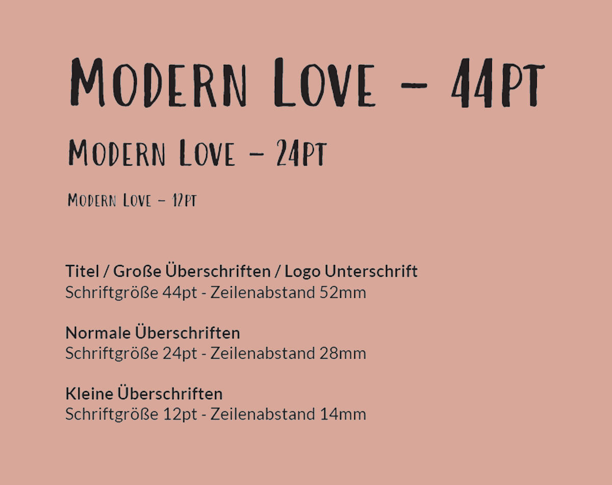„Modern Love“ bildet die charakteristische Schriftart des Branddesigns. Sie wird ausschließlich in einem einzigen Schnitt und in Großbuchstaben verwendet. Diese Schrift kommt sowohl im Logo als auch für sämtliche Titel oder große Überschriften zum Einsatz. Primär für Überschriften konzipiert, kann sie auch in Fließtexten verwendet werden, um diese zu betonen und dem Text Charakter zu verleihen. Generell ist es essenziell, „Modern Love“ stets zu verwenden, wenn die Schrift den Charakter der Marke widerspiegeln soll.